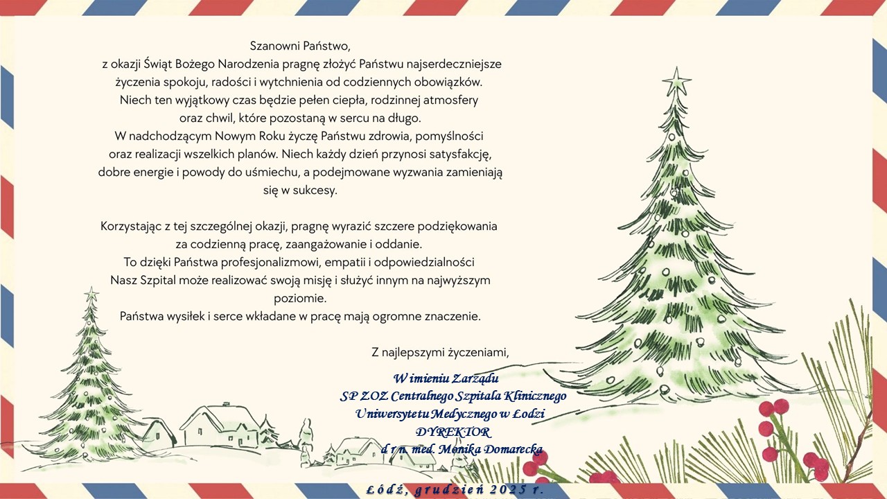 Życzenia z okazji Świąt Bożego Narodzenia oraz Nowego Roku 2026 w imieniu Zarządu SPZOZ Centralnego Szpitala Klinicznego Uniwersytetu Medyczneg...